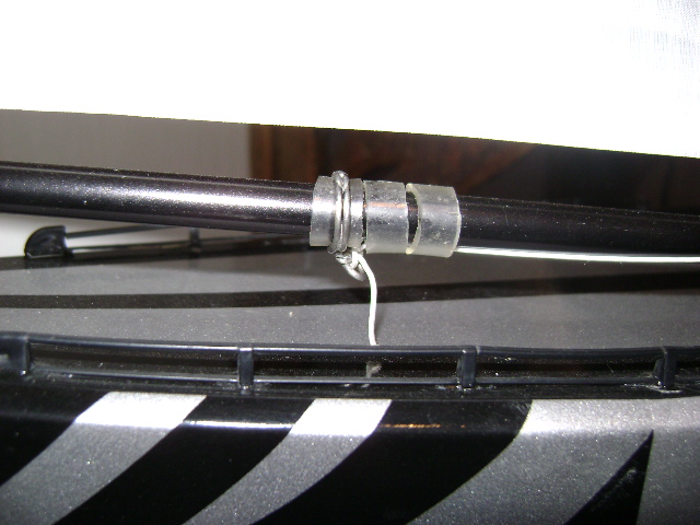 Entre la pieza de plástico que encaja en la rótula y el tubo, se ha colocado un tubito de silicona, (de combustible glow), entre dos arandelas metálicas, para absorber el retroceso del quitavueltas.